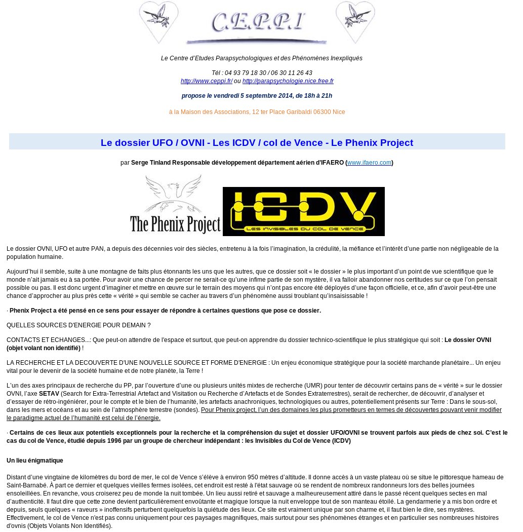 Le CEPPI ( Centre dEtudes Parapsychologiques et des Phénomènes Inexpliqués) nous a invité pour faire une conférence sur nos activités ufologiques à Nice . Serge parlera aussi du projet phénix.