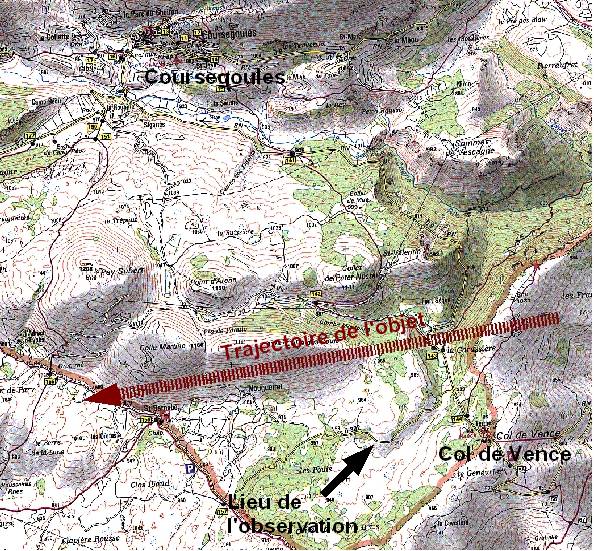- La trajectoire était inhabituelle pour un avion: Est-Nord-Est vers Ouest, à quelques degrés du zénith, au Nord par rapport à nous (donc à la verticale de la zone colle de Pouis - colle Martine).