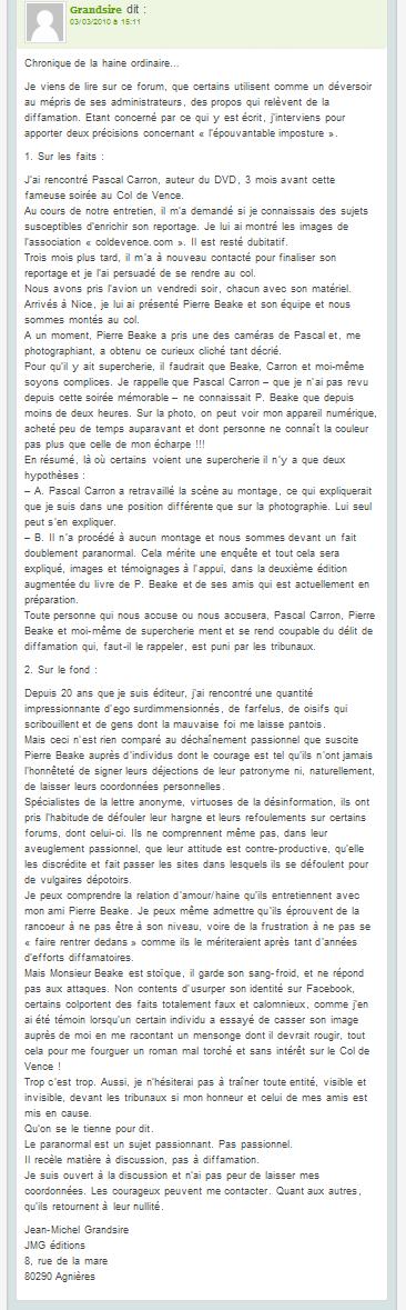 Les dérapages répétés de M.Grandsire et ses déclarations fallacieuses ne peuvent que le desservir et le décrédibiliser un peu plus. Cette histoire de monopole sur le col de Vence est totalement ridicule et absurde quand on sait que nous avons créé notre association pour éviter justement la mainmise de certains sur les mystérieux phénomènes du Plateau de la Lune.