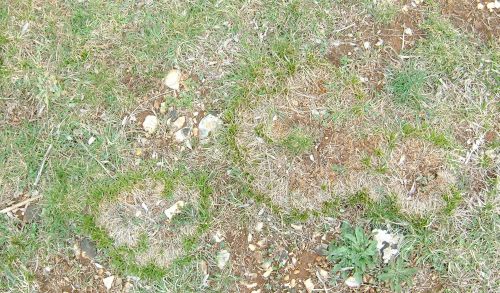 - Une autre trace, très petite cette fois, créée indirectement par des champignons qui modifient localement les minéraux du sol, l'herbe poussant "plus verte" à certains endroits
